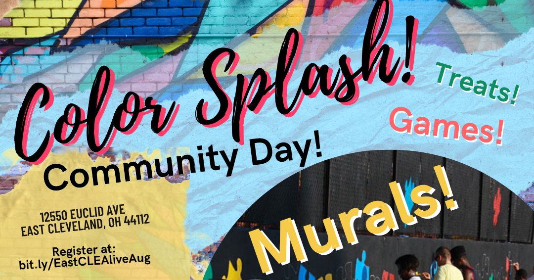 Join us for this FREE, Sunday Funday event at the Historic Mickey’s Building in East Cleveland for an afternoon of art, creativity and community as we give our neighborhood a splash of color together. Enjoy outdoor games, summer treats, music & more! Plus, help artists Robin Robinson and Dayz Whun create new murals to be displayed at the East Cleveland Public Library!